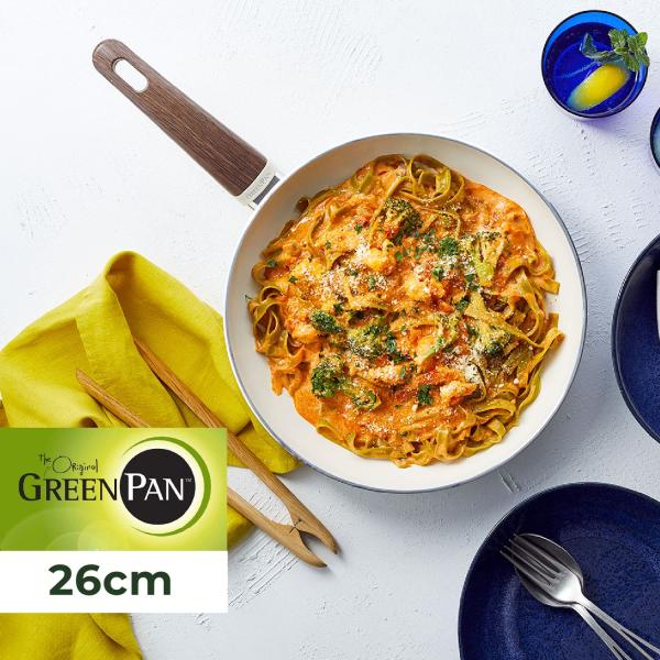GREEN PAN(グリーンパン)は2007年にベルギーで誕生した、セラミック・クックウェアのパイオニア的存在です。一般的なフライパンに使われるフッ素樹脂(テフロン)を使わずに、セラミックコーティングの魅力を発揮した商品を展開しています。 「Wood-be FRYING PAN(ウッドビー フライパン)」は、やさしさを感じるホワイトカラーに、ウッド調のハンドルをあわせたおしゃれなデザイン。フライパンの内側にはハンドルを接続するリベットがないので、汚れがたまりにくくお手入れしやすいのも特徴です。