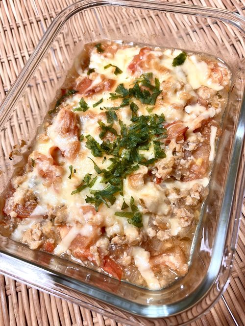 トマトを加えてサッと混ぜ合わせたら耐熱容器に移し入れ、とろけるチーズをのせます。