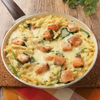ほうれん草を加え、耐熱容器に盛ります。チーズをのせて、トースター200度で10分加熱します。