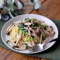 茹でたパスタを加えてよく絡めたら塩こしょうで味をととのえ、器に盛り付けます。粉チーズ、粗挽き黒こしょうをかけたら完成です。