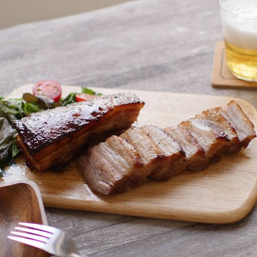 甘辛いしょうゆだれに漬け込んだ豚バラ肉に、たっぷりと黒こしょうをかけてオーブンで焼くスパイシーなチャーシューです。焼く前にはちみつを塗ることで、肉の表面に照りがでてツヤツヤの仕上がりに。