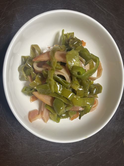 - ピーマンは繊維に沿って切ることで食感が残ります。
