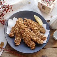 袋に福豆を入れて叩き、唐揚げの衣にしました。たっぷりと衣づけしたささみは十分満足感あるひと品に。しっとりやわらかいささみと、福豆のザクザクとした食感、風味が口いっぱいに広がります。