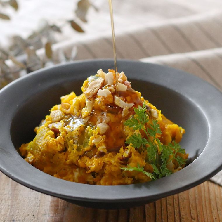 レンジで加熱したかぼちゃとさつまいもをヨーグルト、はちみつ、マヨネーズ、粒マスタードで和えるサラダ。ミックスナッツの食感がアクセントになって、おすすめです。