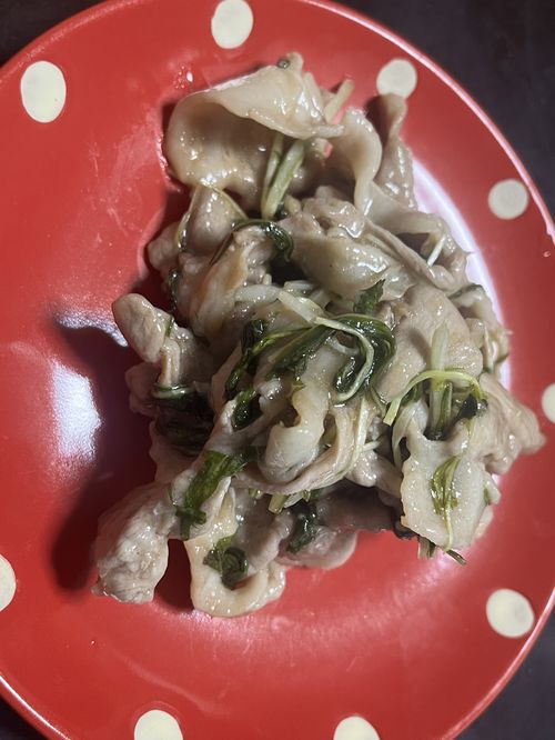 豚肉に火が通ったら水菜を加えて、さっと炒めます。