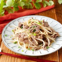もやしを端に寄せ、(a) を入れて混ぜ合わせ、全体に味がなじんだら完成です。