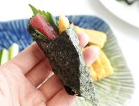 製氷皿からはずし、サーモンにいちょう切りにしたレモン、まぐろにわさび、厚焼き卵にいくらをトッピングして完成です。お好みでしょうゆをつけてお召し上がりください。