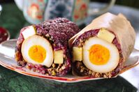 ごはんの上に豚肉そぼろと高菜を敷きつめ、煮卵とチーズをのせます。
