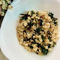 鮭フレーク、醤油、ごま油を入れてしっかり混ぜ合わせます。