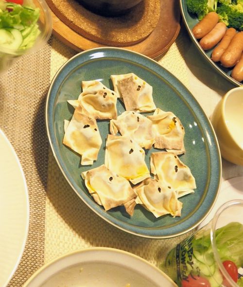 餃子の皮にストローで穴をあけておばけの顔を作ります。