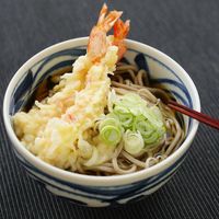 ②をそばにかけ、かまぼこ、ねぎ、海老の天ぷらをトッピングして完成です。