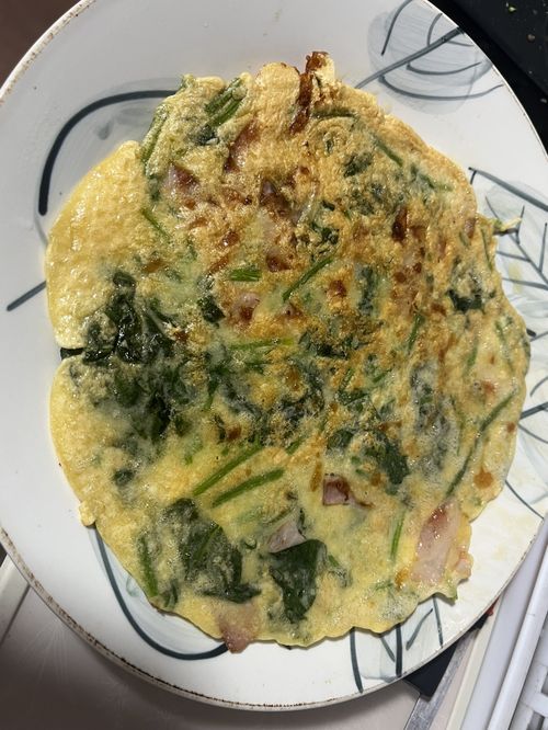 (a) を混ぜ合わせ、ほうれん草、ベーコン、チーズを加えて全体を合わせます。