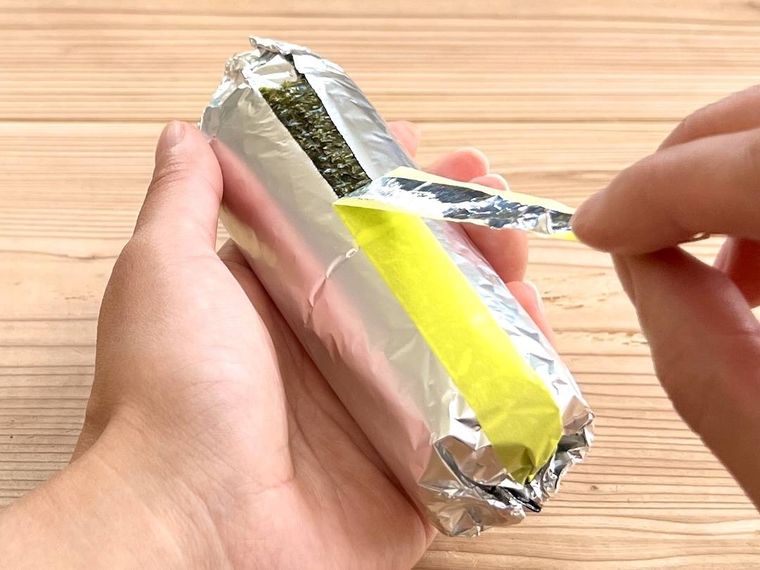 撒き終わったらラップの上からぎゅっぎゅっと押さえて形を整え、海苔とごはんが馴染むようそのまま5分ほど置きます。
