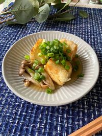 焼いた豆腐を皿に盛り、あんをかけます。お好みでねぎをトッピングして召し上がれ♪