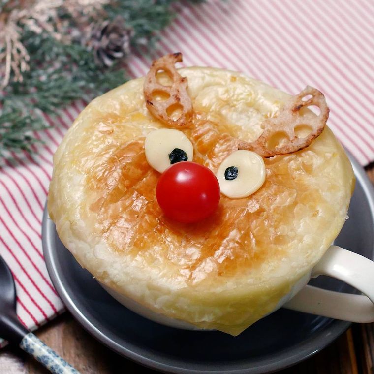 煮込みハンバーグにチーズやれんこんなどトッピングして、トナカイに見立てます。見た目がかわいらしいので、クリスマスにぴったり。子供と一緒にトッピングしても楽しいですよ。
