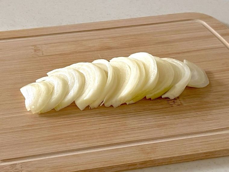 1. 新玉ねぎを縦半分にカットし、繊維を断ち切るようにスライサーでスライスします。