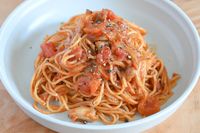 フレッシュトマトのパスタにたっぷりのタプナードとトッピングはナスの皮を細切りにしてオリーブオイルで揚げ焼きにしたもの♡