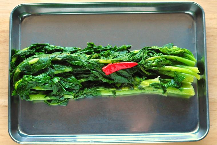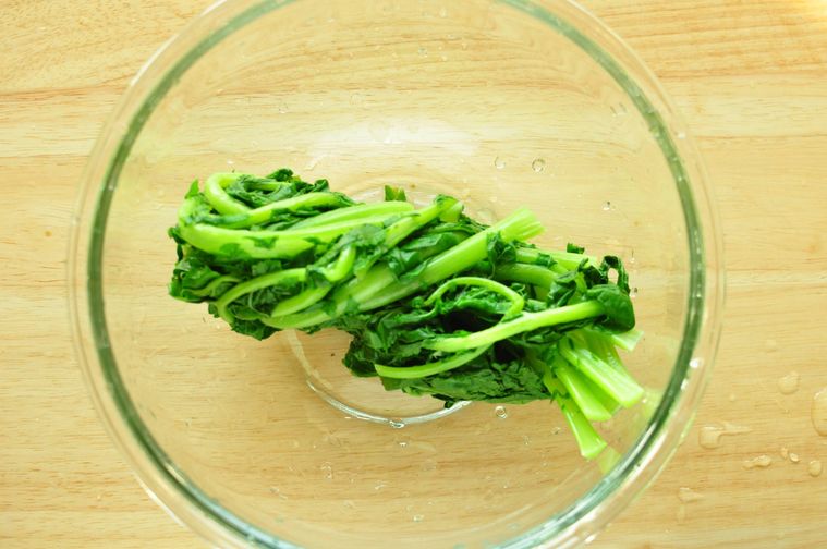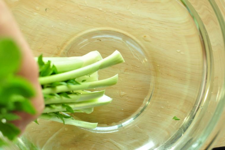 湯から引き上げたらすぐに冷水にとり、一度水を取り替えてしっかりと冷まします。こうすることで鮮やかな色が保たれ、アクも抜けます。