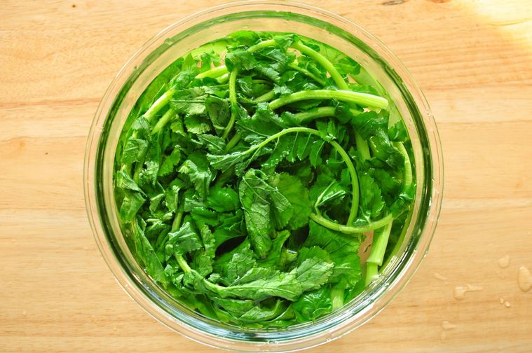 大根の葉はボウルに溜めた水にしばらく浸し、汚れを浮かしてから流水で洗います。根元に近い部分は泥が付いている場合があるのでしっかりと洗ってください。