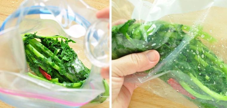 ジッパー付き保存袋に大根の葉を入れ、赤唐辛子と塩、酢を加えて袋の外から手でしっかりともみます。