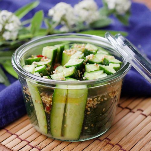 ポリポリ食感が楽しめる、ひんやり冷たいきゅうりの漬物レシピです。すりおろしにんにくとごま油の香ばしい風味が食欲を刺激します。赤唐辛子のピリッとした辛味がアクセントになって、あとひくおいしさです。作り置きできるので便利ですよ。