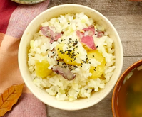 さつまいもをのせて炊き込みごはんモードで炊飯します。