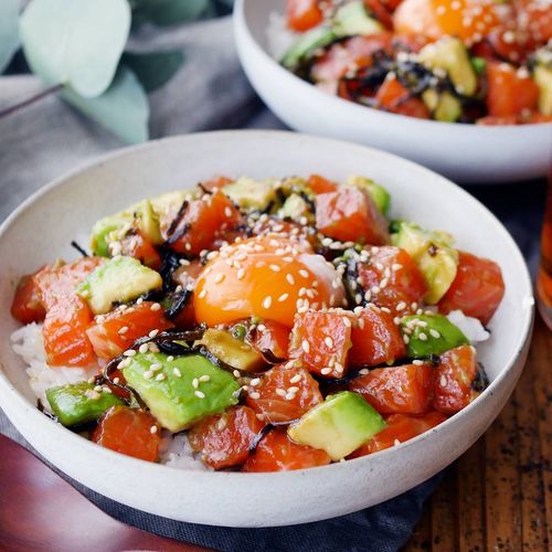 サーモンを濃厚に味わえる丼レシピです。サーモンとクリーミーなアボカドは定番の組み合わせ。サーモンを角切りにするため、特徴的なねっとり食感も楽しめます。風味豊かなめんつゆの味付けに塩こんぶで旨味を、ごま油とにんにくで香りを足すのがポイントです。彩り良く仕上がるため、ひと品でも華やかな食卓が作れますよ。