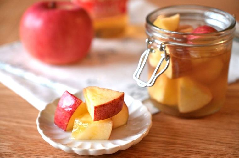 りんごはよく洗い芯や種の部分を取り除いてから皮ごとスライスし、耐熱容器に入れてふんわりとラップし電子レンジ500W約1分半加熱ししんなりさせます。