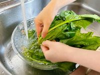 水道の水を細く流しながら、フィルムを使ってパックの汚れを落としていきます。このとき、フィルムはネバネバしている面を使います。