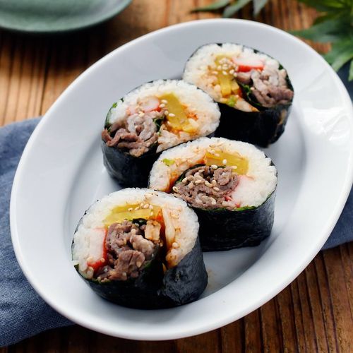 - キンパの牛肉をレンジ加熱し、キンパを仕上げる