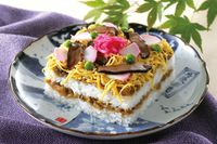 鯖のおぼろとすし飯を二段に重ねて具材をちりばめた、華やかな郷土寿司です。