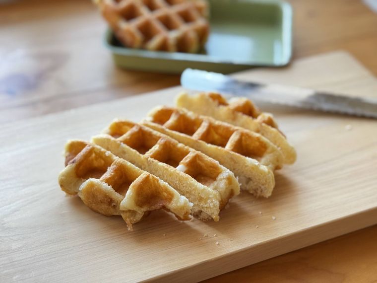 ワッフルの凹凸に沿って包丁を入れ、細長くカットします。パン切り包丁を使うと、崩れにくくきれいにカットできるのでおすすめです。