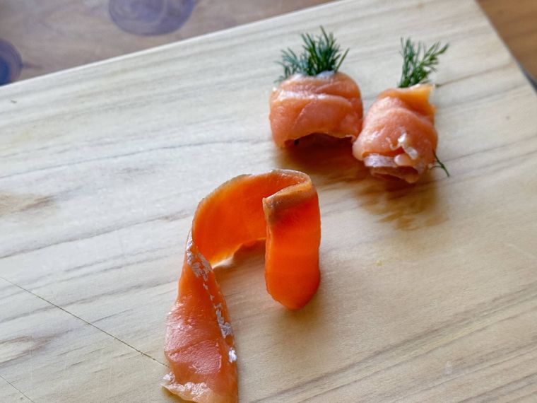 続いて具材の準備をします。ディルを芯にし、スモークサーモンを巻き付けるように丸めてください。
