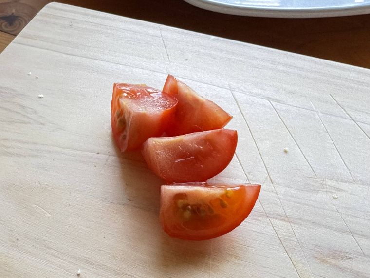 ミニトマトは4等分にカットし、アボカドは薄くスライスします。ケールは食べやすい大きさにちぎってください。