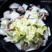 白菜の芯部分を加えて、中火で3分ほど炒め、表面が透き通るまで炒めます。