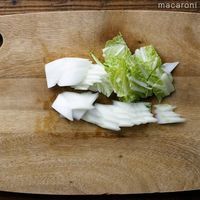 白菜を葉と芯に分け、葉は3cm幅のざく切りに、芯は葉の大きさより小さめに削ぎ切りにします。