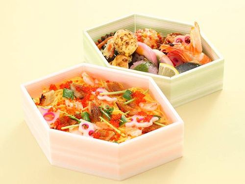 華やかなちらし寿司と、海老、はまぐりタルタル焼き、鰆西京焼き、紅白かまぼこなどの一品料理が入った二段のセットです。