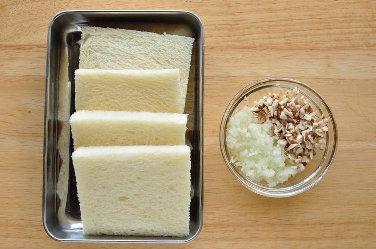 食パンの耳を切り落とします。玉ねぎとしいたけはそれぞれみじん切りにします。余ったパンの耳はおやつやおかずの材料としてぜひ活用してくださいね。
