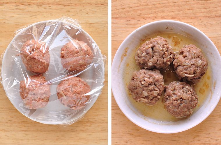 肉だねを4等分して丸め、耐熱皿に並べ入れます。ラップをふんわりとかけて電子レンジ600Wで3分加熱します。