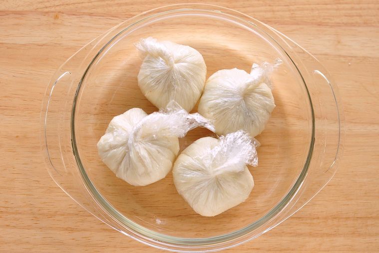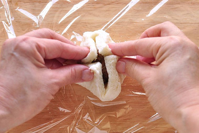 パンの四隅の角を中心部に寄せ、縁同士を密着させてラップに包み、ギュッとねじって茶巾絞りにします。