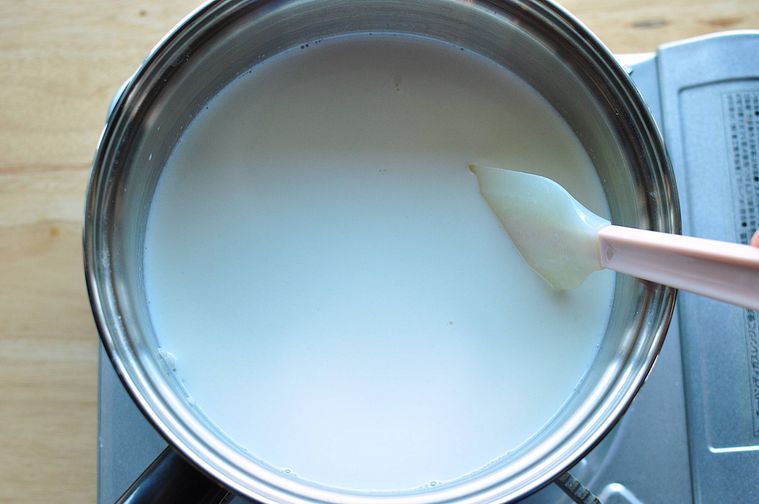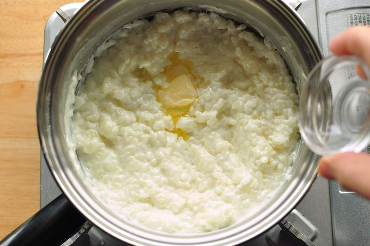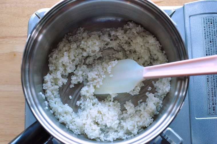 米が水を吸ったら牛乳を加え、焦げ付かないようにときどきかき混ぜながらごく弱火で30分ほど加熱します。