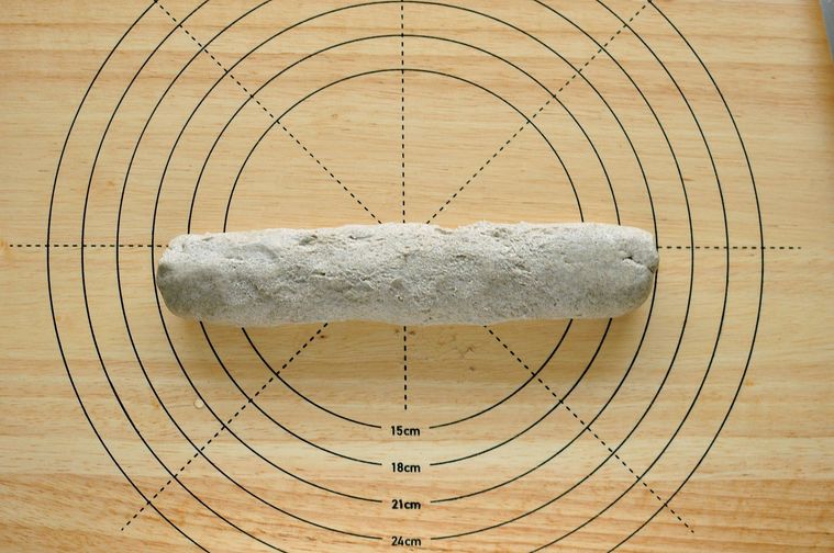 生地を棒状にのばして台に置きます。