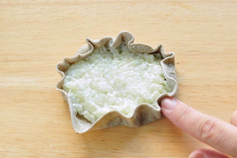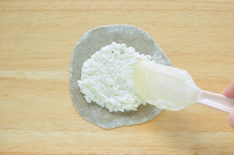 ミルク粥を包むように生地の縁を中心に向けて折りたたみ、指でひだを寄せます。