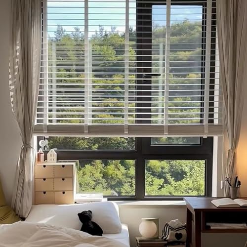 ねじで壁に取り付けるタイプの縦型ブラインドです。ひもを操作して開閉やスラットの角度調整をおこないます。適度に光を遮るため、暑い季節の省エネにもなりますよ。