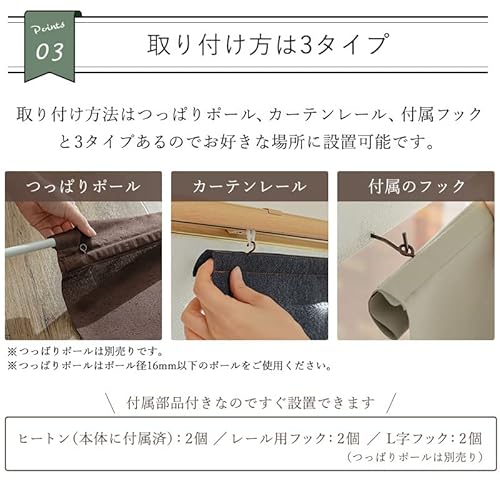 設置方法は突っ張り棒・カーテンレール・付属フックの3タイプ。壁に穴を開ける必要なく、工具も不要なのが魅力です。