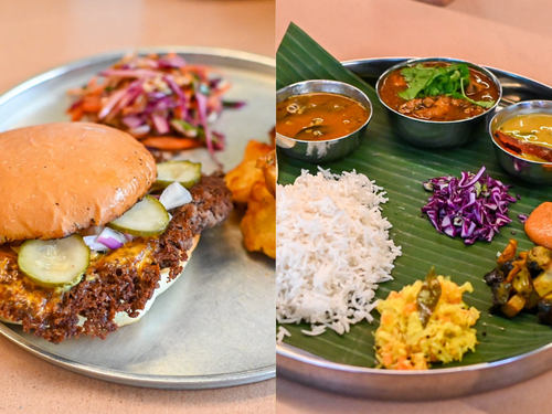 鉄板に押し付けて焼き上げるたパティを挟んだ「スマッシュバーガー」は、香ばしい風味とともにひと口食べるほどにガツンとした肉の旨みを味わえるのがポイント。コールスローサラダや、 “しっかりおいしい” ヴィーガンバーガーも提供されています。