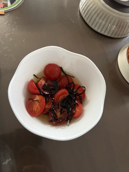 ボウルにミニトマト、塩こんぶ、しょうゆ、レモン果汁を入れてさっと混ぜ合わせて5分ほどおきます。