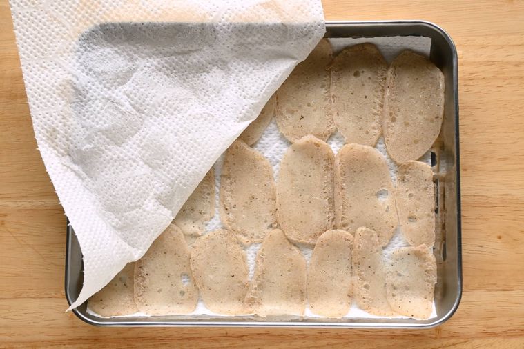 こんにゃくをギュッと絞ってからキッチンペーパーに取り、水分を取り除きます。