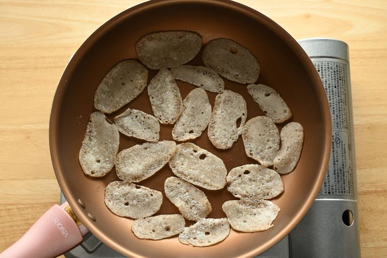 フライパンにごま油をひき、こんにゃくを並べ入れてほどよい焦げ目が付くまで焼きます。