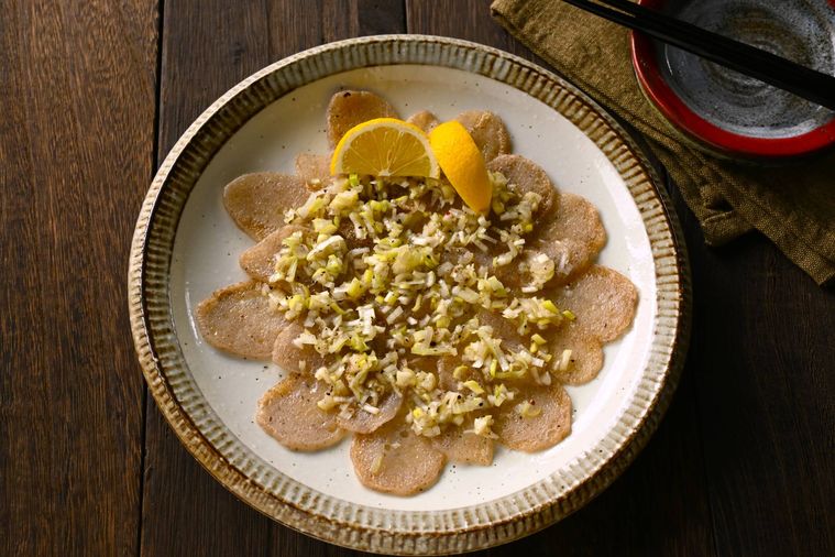 薄切りにしたこんにゃくで作る食べ応えバッチリなひと品です。こんにゃくは冷凍庫で凍らせてから解凍すると、水分が抜けて弾力のある食感に。特製ねぎダレを添えれば「まるで牛タン」なひと皿が完成しますよ。